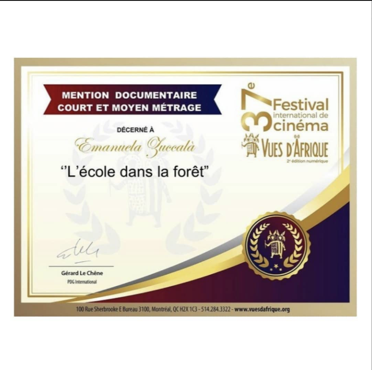 Honorable mention at the Vues d’Afrique Festival, Canada