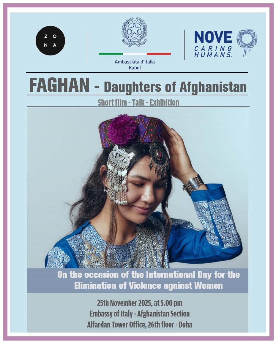 Nella Giornata Internazionale per l’Eliminazione della Violenza contro le Donne, 25 novembre, in linea con l’impegno del MAECI e della rete diplomatico-consolare italiana contro la violenza di genere e contro ogni forma di discriminazione, presso l’Ambasciata d’Italia Kabul a Doha si è inaugurata la mostra “Faghan. Figlie dell’Afghanistan”, in collaborazione con la ONLUS NOVE Caring Humans e ZONA.